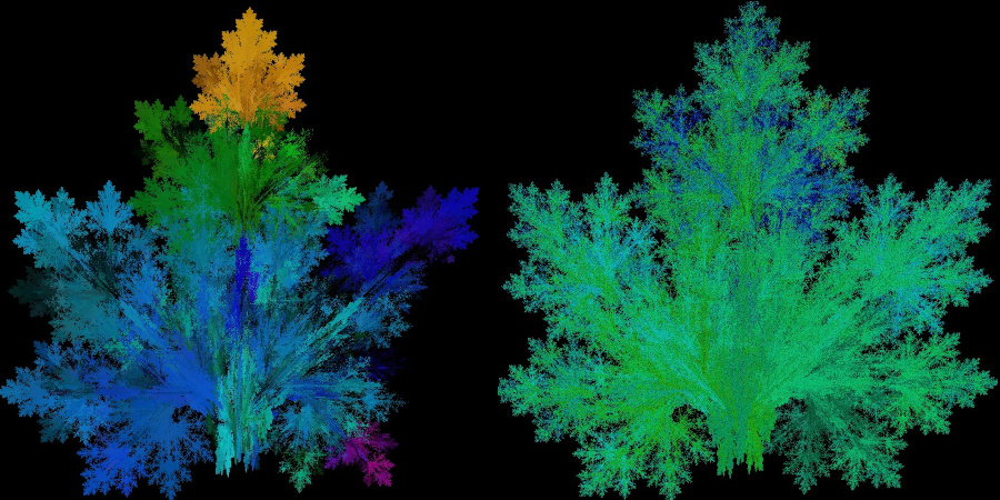 Was für ein Unterschied! Bleibt die Frage: Wie ändern sich die Blatt-Fraktale, wenn man die beiden